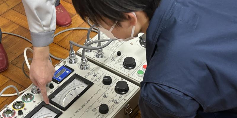 継電器試験器を操作している様子。最小動作電流試験では、試験電流で遮断器が正しく動作するかを体験しました。
