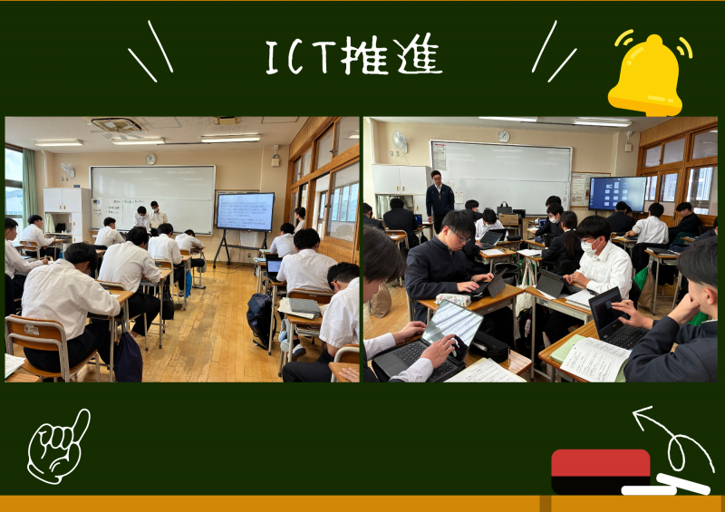 本校で行われる多くの授業では、電子黒板やタブレット端末を活用し、図や動画、実験結果などを視覚的に提示しています。さらに、生徒自身がタブレットを使って調べ、まとめ、発表する活動を取り入れ、ICTを活用することで、生徒が主体的に考え、意見を共有できる授業なども積極的に行われています。